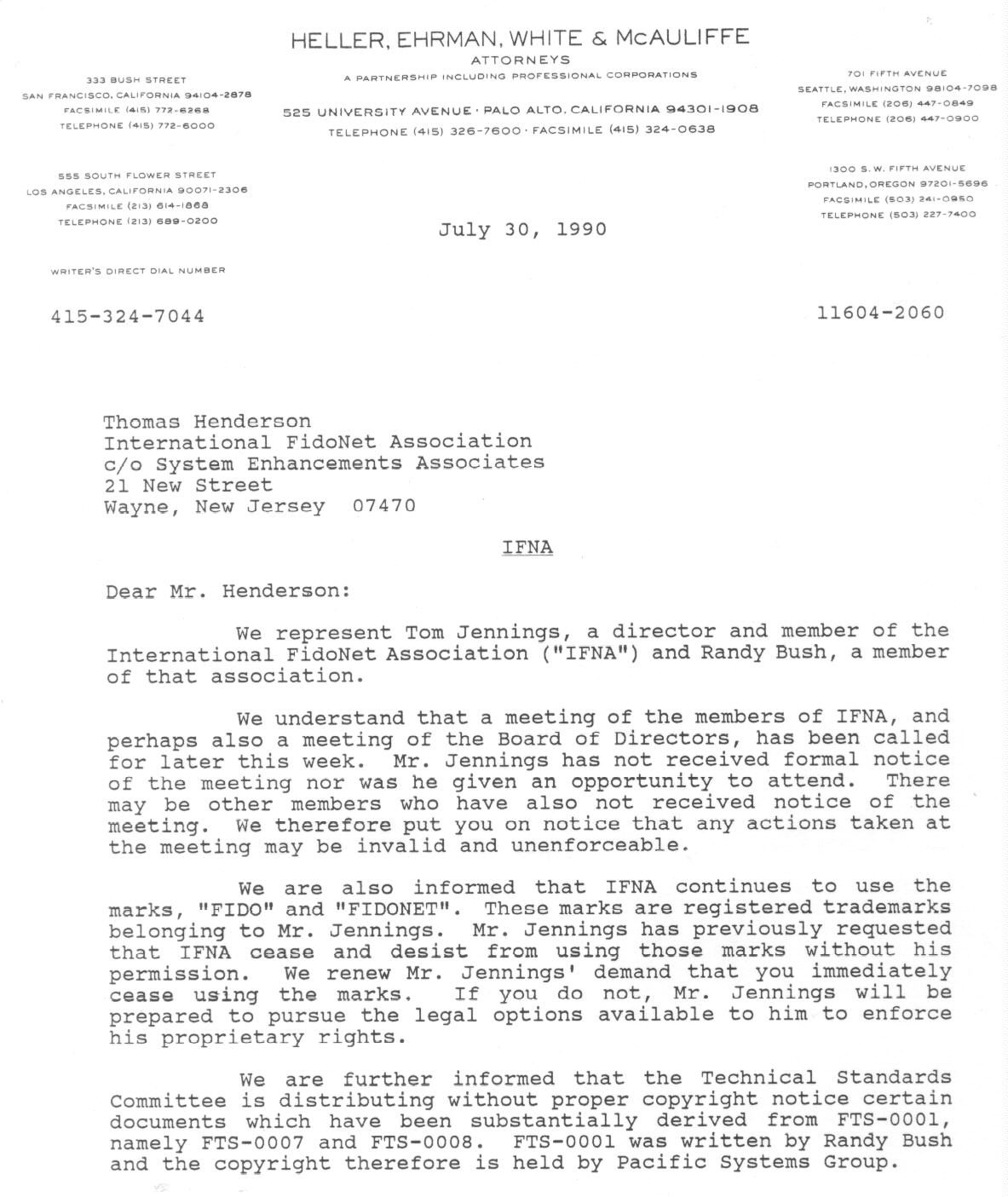 | Letter from Tom Jennings' Lawyers to Thom Henderson Regarding IFNA's Use of Fidonet Trademarks (July 30, 1990)