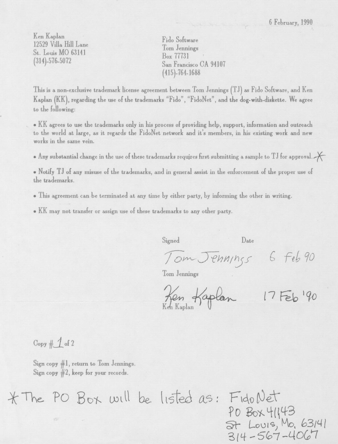 | Agreement Between Ken Kaplan and Tom Jennings Regarding Use of FidoNet Trademarks (February 6, 1990)