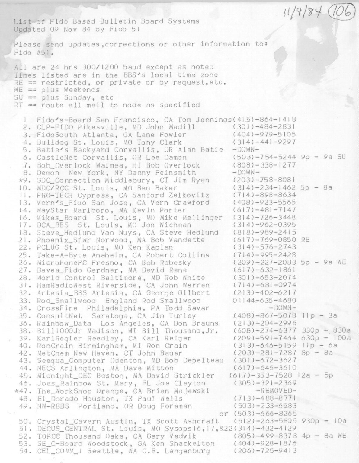 | List of Fido Based Bulletin Board Systems (November 9, 1984)